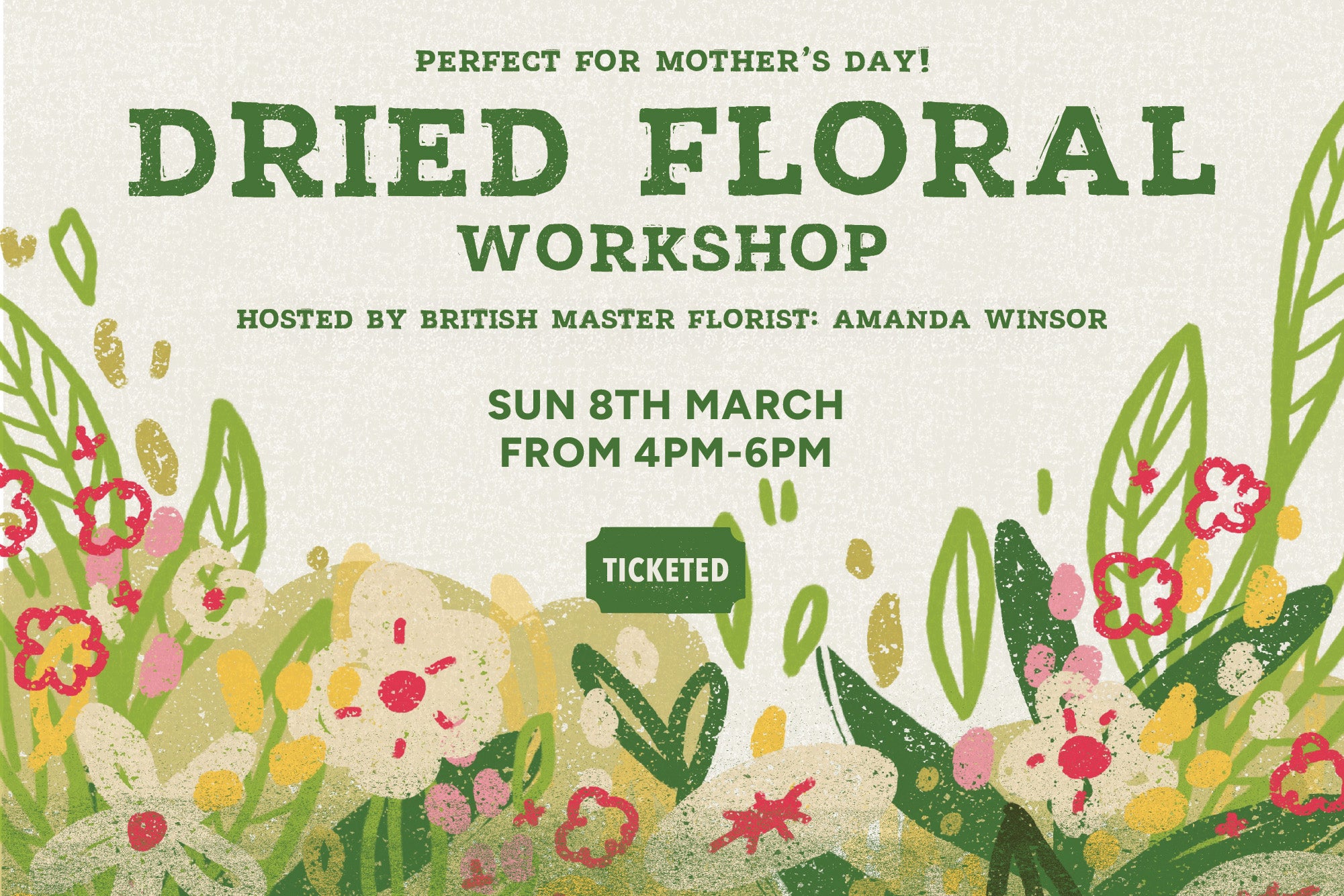 Join us here at the Farm Shop on Sunday 8th March for a relaxed and cosy workshop with British master florist Amanda Winsor. Amanda will guide you through making a gorgeous dried floral arrangement to take home, with all materials supplied, alongside a nice cup of tea and cake. Perfect for Mother's Day; either gift the finished arrangement or the experience of creating it together!