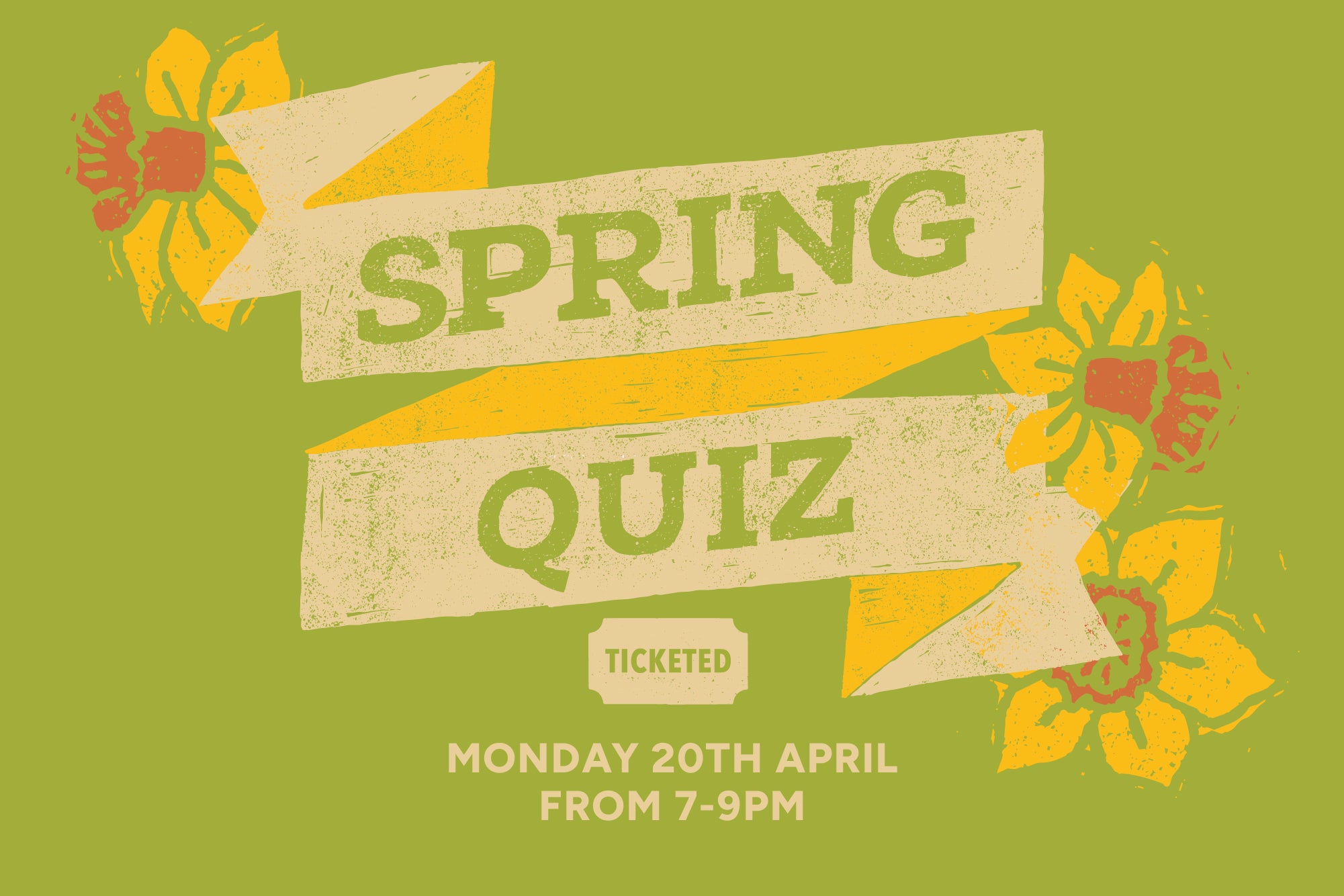 Join us in the Greendale Kitchen on 20th April at 7pm for our special Spring Quiz! We'll be settling in for a multi-round general knowledge quiz so grab your friends and get your thinking caps on! Places are limited and the ticket price includes Steak & Ale Pie and Chips. Teams of up to 6 people. We'll end the evening with a tense game of Play Your Cards Right for a chance to win a cash prize - so bring some change for a chance to have a go!